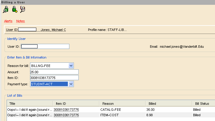Billing fees usually serve as “catch all” fees and are almost always non-refundable. For items that do not have overdue fines, the bill serves as a reminder to return items within a reasonable amount of time. They also are meant to cover the time staff members actually spend on billing (contacting users, modifying records, filling out paperwork for Student Accounts, etc.). Lastly, they can also be used to cover costs when binding replacements. Current practice is to waive billing fees for items lost when borrowed through ILL (See How to Bill ILL).